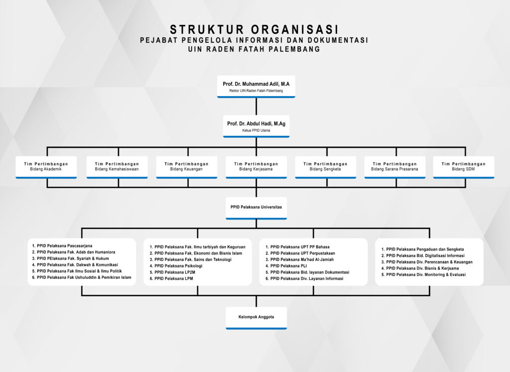 Tugas utama PPID UIN Raden Fatah meliputi pengelolaan informasi publik, pelayanan informasi kepada masyarakat, pembuatan dan penyediaan informasi publik, serta pengelolaan dokumen-dokumen publik. PPID juga bertanggung jawab untuk memastikan bahwa informasi yang relevan dan penting bagi publik tersedia secara transparan dan mudah diakses. Dengan demikian, PPID UIN Raden Fatah memiliki peran penting dalam mendukung transparansi, akuntabilitas, dan partisipasi publik dalam lingkungan akademik dan administratif di UIN Raden Fatah Palembang.